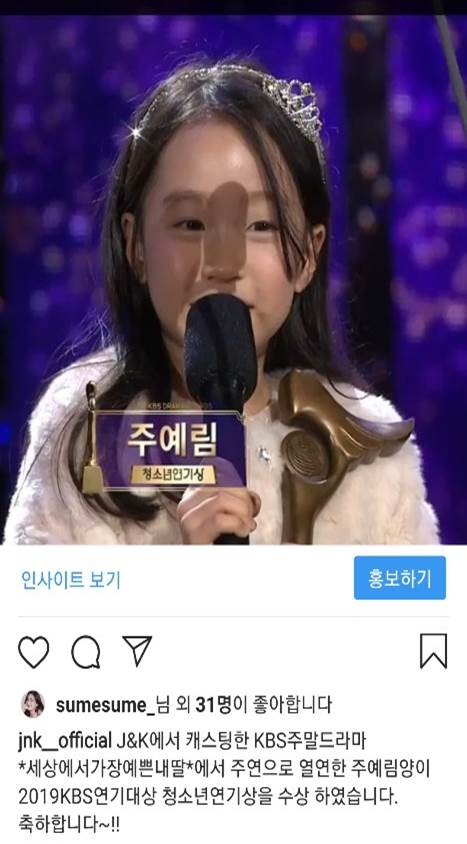 당사에서 캐스팅한 주예림양이 2019년 KBS연기대상 청소년연기상 수상